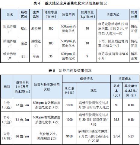 重慶永川、榮昌、璧山等區(qū)域,主養(yǎng)鯽、草、鰱、鳙、烏鱧、翹嘴紅■等,每年均會爆發(fā)不同程度的草魚老三病、細菌性敗血癥等魚病。2015年,在通威技術(shù)人員的宣傳推廣下,重慶多個地區(qū)的養(yǎng)殖戶采用殺菌電化水消毒池塘水體,配合肝膽舒靈、三黃散等內(nèi)服藥物,持續(xù)使用3-6個月,均未出現(xiàn)大規(guī)模病情,顯然殺菌電化水消毒水體配合藥物內(nèi)服可有效預防疾病爆發(fā),與周邊使用氯制劑等其他消毒產(chǎn)品的池塘相比,效果顯著,詳見表4。