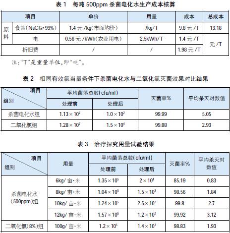 按小型(400L/h)殺菌水機,鹽水濃度7‰,功率1kW;設(shè)備折舊費按平均年限法計。表1顯示,500ppm殺菌電化水生產(chǎn)成本為13.18元/噸,按1.3所述推薦用量計算得:預防消毒時成本為0.09-0.15元/畝·米,配合治療消毒時成本為0.16-0.2元/畝·米。