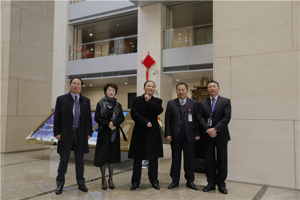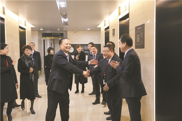 劉漢元主席等總部領(lǐng)導(dǎo)在大廳迎接新年后第一天上班的員工