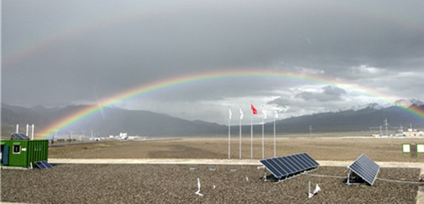 通威集團(tuán)“青藏綠色驛站”離網(wǎng)光伏發(fā)電系統(tǒng)在彩虹下映照