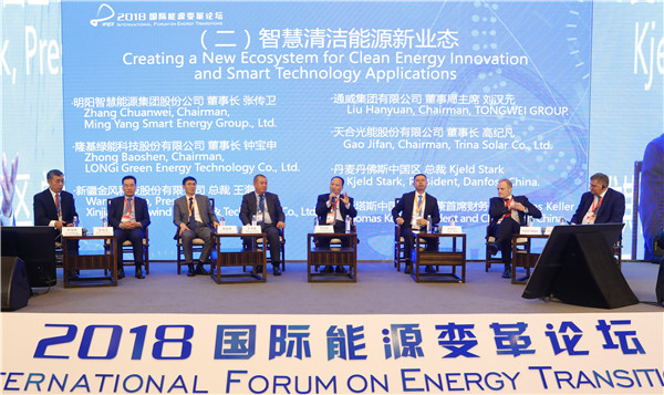 當天下午,以“營造智慧清潔能源的創(chuàng)新應(yīng)用新生態(tài)”為主題、由國家應(yīng)對氣候變化戰(zhàn)略研究和國際合作中心首任主任李俊峰主持的對話環(huán)節(jié)成為關(guān)注焦點,通威集團董事局劉漢元主席、朝陽智慧能源集團股份有限公司董事長張傳衛(wèi)、隆基綠能科技股份有限公司董事長鐘寶申、常州天合光能有限公司董事長高紀凡、丹麥丹佛斯中國區(qū)總裁Kjeld Stark等行業(yè)領(lǐng)軍企業(yè)家同臺交流,精彩對話。