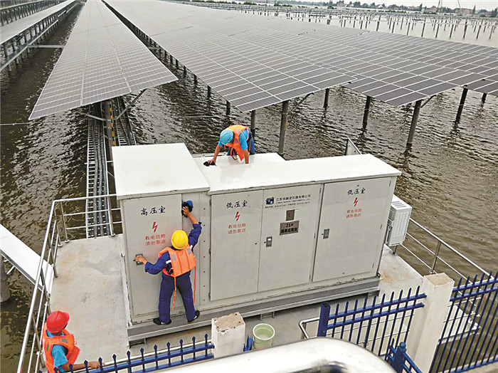 通威常德“漁光一體”項目工作人員夜以繼日加緊施工,保證項目按時并網