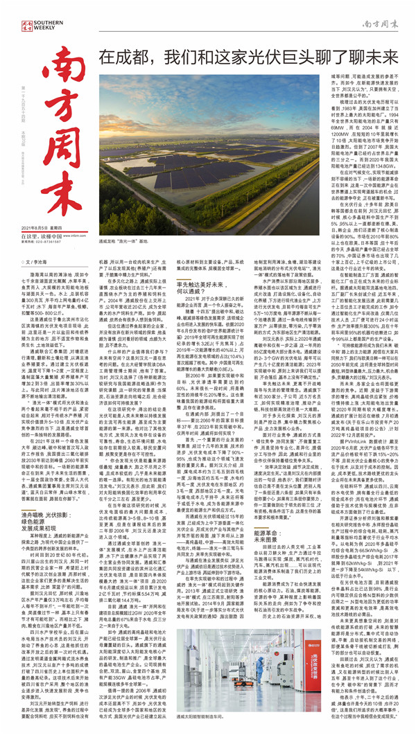 8月5日,最新推出的《南方周末》以《在成都,我們和這家光伏巨頭聊了聊未來》為題,對(duì)通威進(jìn)行了整版專題報(bào)道,報(bào)道聚焦“漁光一體”、光伏行業(yè)、智能制造等方面,并專訪了劉漢元主席。