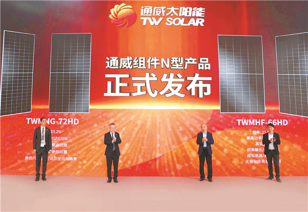 5月24日,中國光伏行業協會名譽理事長王勃華,全國人大代表、全國工商聯副主席、通威集團董事局劉漢元主席,通威股份董事長、CEO劉舒琪,通威股份副董事長嚴虎,通威集團副總裁胡榮柱、黃其剛,通威股份副總裁、永祥股份總經理李斌,通威股份監事會主席鄧三,總裁助理、通威太陽能(合肥)有限公司總經理蕭圣義,光伏首席技術官邢國強博士,中國質量認證中心副主任徐少山、新能源產品認證部總監張雪,江蘇微導納米科技股份有限公司技術負責人廖寶臣,通威股份光伏商務部組件全球營銷總經理邱新出席通威組件N型產品發布會。