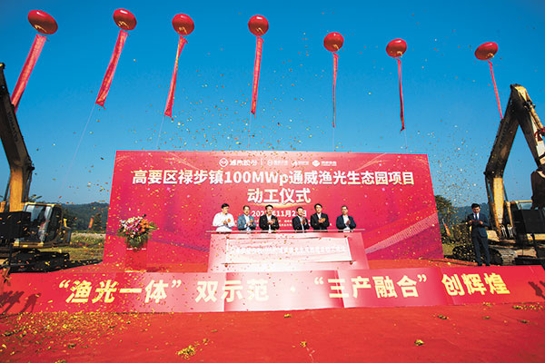 11月21日,通威祿步“漁光一體”生態園項目動工儀式成功舉行。肇慶市高要區委常委、常務副區長李冠藝,副區長黃興榮出席儀式,黃興榮副區長致辭表示,通威祿步“漁光一體”生態園項目利用“光伏+”復合模式,實現漁業養殖與發電兩不誤,是高要區積極探索產業耗能綠色轉型和可持續發展的新路子,更是推動經濟社會高質量發展的重要舉措,對促進當地相關產業發展,擴大就業和發展第三產業具有積極意義。