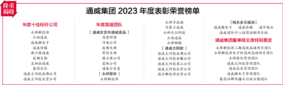 在當(dāng)天的年度表彰環(huán)節(jié)中,2023年通威集團(tuán)十佳標(biāo)桿公司、2023通威年度英雄團(tuán)隊(duì)、通威集團(tuán)董事局主席特別嘉獎(jiǎng)隆重揭曉。回眸2023,我們聚焦主業(yè)、敢拼善為;展望2024,我們踔厲奮發(fā)、勇毅前行。在劉漢元主席的堅(jiān)強(qiáng)帶領(lǐng)下,全體通威人將永葆危機(jī)感與使命感,始終堅(jiān)持效率優(yōu)先,始終堅(jiān)持開拓創(chuàng)新,以時(shí)不我待的精神,勤練內(nèi)功,奮力在新時(shí)代新征程上贏得更大的勝利!
