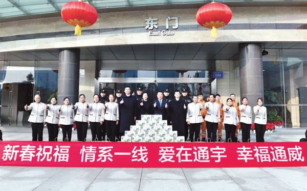 2月12日,農歷大年初三,通威集團黨委書記、副總裁黃其剛前往通威國際中心,親切慰問春節假期堅守崗位的一線值班員工。黃總特別轉達了劉漢元主席對大家的暖心問候,并發放了新春禮包,向堅守崗位的員工致以新春祝福和節日問候。期間,黃總逐一查看了秩序部、環境部、工程部等值班崗位,每到一處都關心詢問了值班人員的崗位工作、食宿安排等情況。對大家春節期間堅守崗位,井然有序地推進值班工作給予了充分肯定,感謝大家的辛勤付出,并鼓勵大家值守期間,加強安全排查和設施維護,確保平安過節。