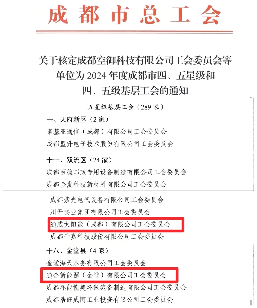 通威太陽能成都公司、通合公司榮獲“成都市五星級工會”稱號