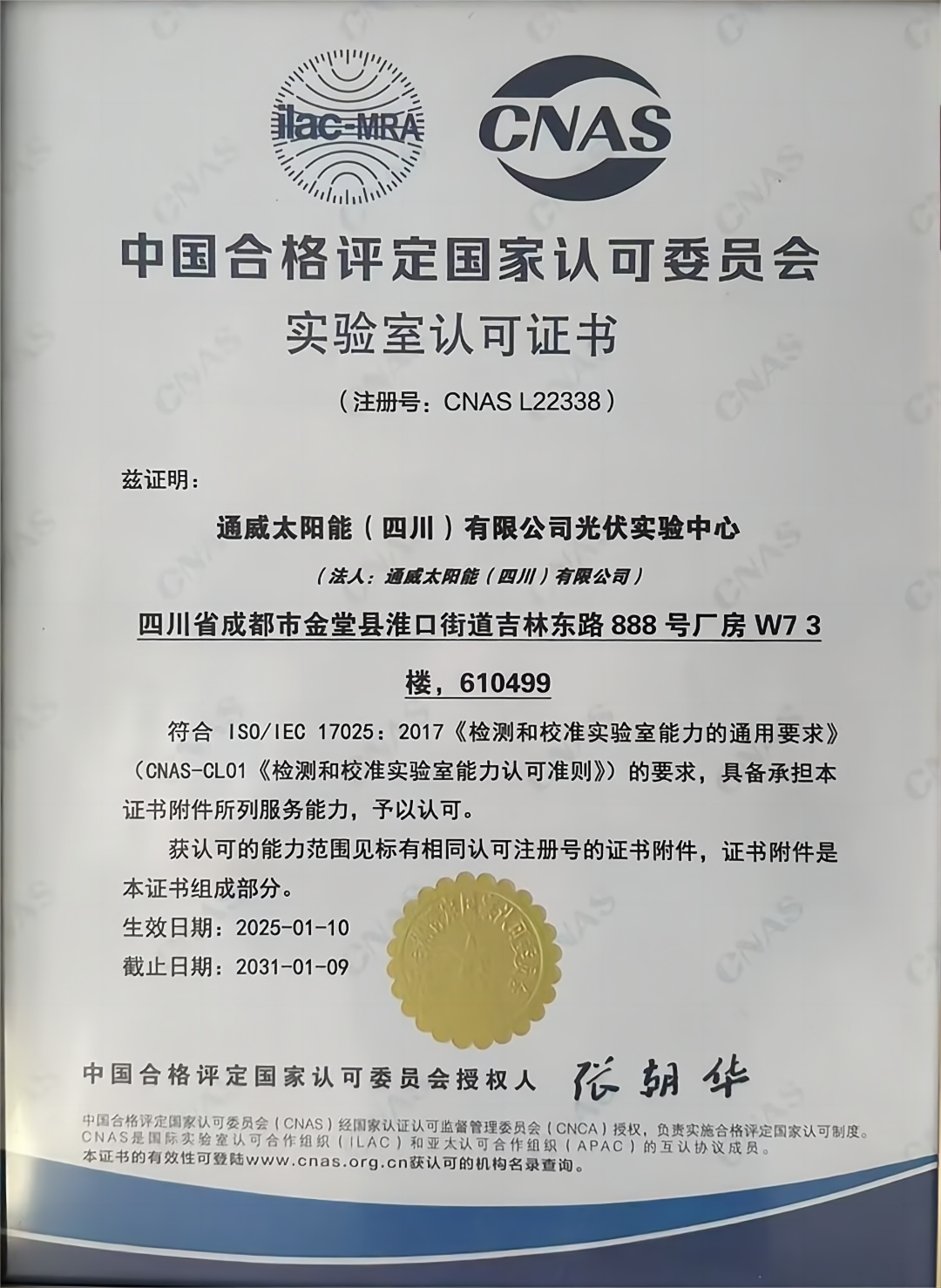 通威太陽能科技金堂基地光伏實驗中心獲CNAS實驗室認可證書