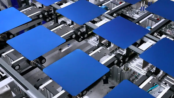 記者走進通威太陽能金堂基地的電池片生產車間,一種科技感撲面而來。這個無塵車間的面積有11個足球場大,10道工序被切割成模塊化的生產環節,每道工序的機器手臂都集中在一個類似火車車廂的倉里,連接倉與倉的是一組組智能機器小車。當上一個倉的加工工序完成,會給小車發出指令,它將自動前往出料口,取上物料再送到下一個倉進行加工。