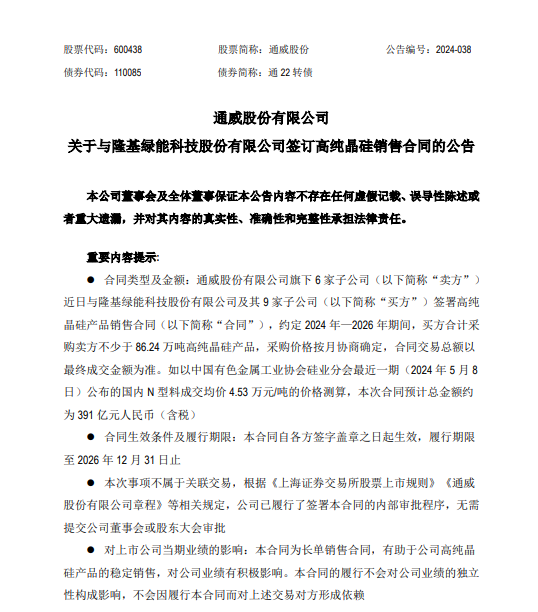 具體而言,雙方采購價格按月協商確定。如以中國有色金屬工業協會硅業分會最近一期(2024年5月8日)公布的國內N型料成交均價4.53萬元/噸的價格測算,本次合同預計總金額約為391億元人民幣(含稅)。通威股份稱本次合同的簽訂有利于公司多晶硅產品的穩定銷售,符合公司未來經營規劃,對公司的經營業績有積極影響。