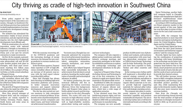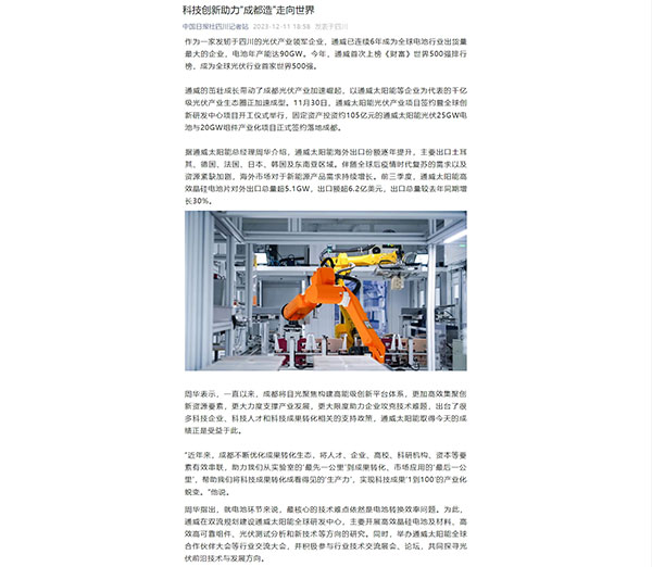 近日,《中國日報》發表題為《科技創新助力“成都造”走向世界》的報道,并在國際版進行全球推送,聚焦通威太陽能科技創新與發展。