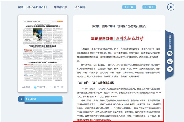 5月25日,華西都市報在題為“交行四川省分行用好‘加減法’為巴蜀發展助飛”的報道中指出,“通威太陽能(眉山)有限公司高效晶硅太陽能電池國產智能裝備(系統)運用項目是四川綠色發展的代表之一。據第三方行業分析機構PV Infolink統計,截至2021年末,通威股份的電池出貨量已連續5年位居全球第一”。