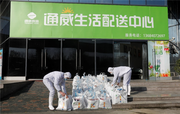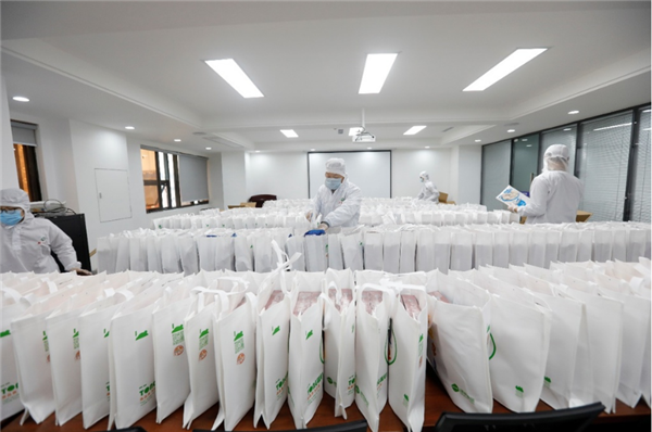 通威食品工作人員將禮包裝袋,準(zhǔn)備為“白衣天使”送貨到家