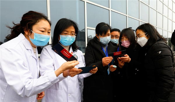 工作人員向醫(yī)護(hù)人員介紹禮包專享卡使用方法